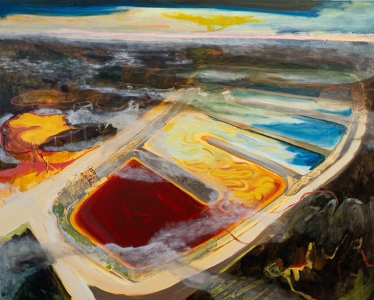 How do we fathom the impact modern living has on our ecological environments? How might we consider land a living being rather than a simple repository of resources or sacrificial zones? The paintings in The Smog Holds as We Sleep and Wake emerge from visual research into the layered histories of Open Hearth Park in Sydney, NS. Once a major economic driver for Cape Breton throughout the 20th century, the former Sydney Steel Mill simultaneously caused one of Canada’s worst environmental disasters. Following 66 years of the mill releasing toxic pollutants into Muggah Creek, residents of Sydney experienced cancer rates 50% higher than anywhere else in Canada. The paintings were created using reference material from on-site drawing, maps, photography, and digital archival imagery from the Beaton Institute. Ghostly traces of people, architecture, machinery, and ecology emerge through rubbing, erasing, and glazing techniques. Palette knives, spatulas, and squeegees treat the surface as an archaeological site by carving into layers of wet paint, excavating hidden colours and marks. Through the painting’s surface, a space beyond reference is uncovered to reflect complex temporal entanglements of ecosystems and built environments.